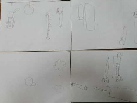 Kroz današnju radionicu, uz pomoć stranih volontera iz Udruga IKS posvetili smo se umjetničkom izražaju. Prvi korak bio je opipavanje raznih predmeta (većim dijelom predmeta koje svakodnevno koristimo, ali i nekih nesvakidašnjih), koje smo zatim pokušali “prenijeti” tj nacrtati na papir (crni tisak).